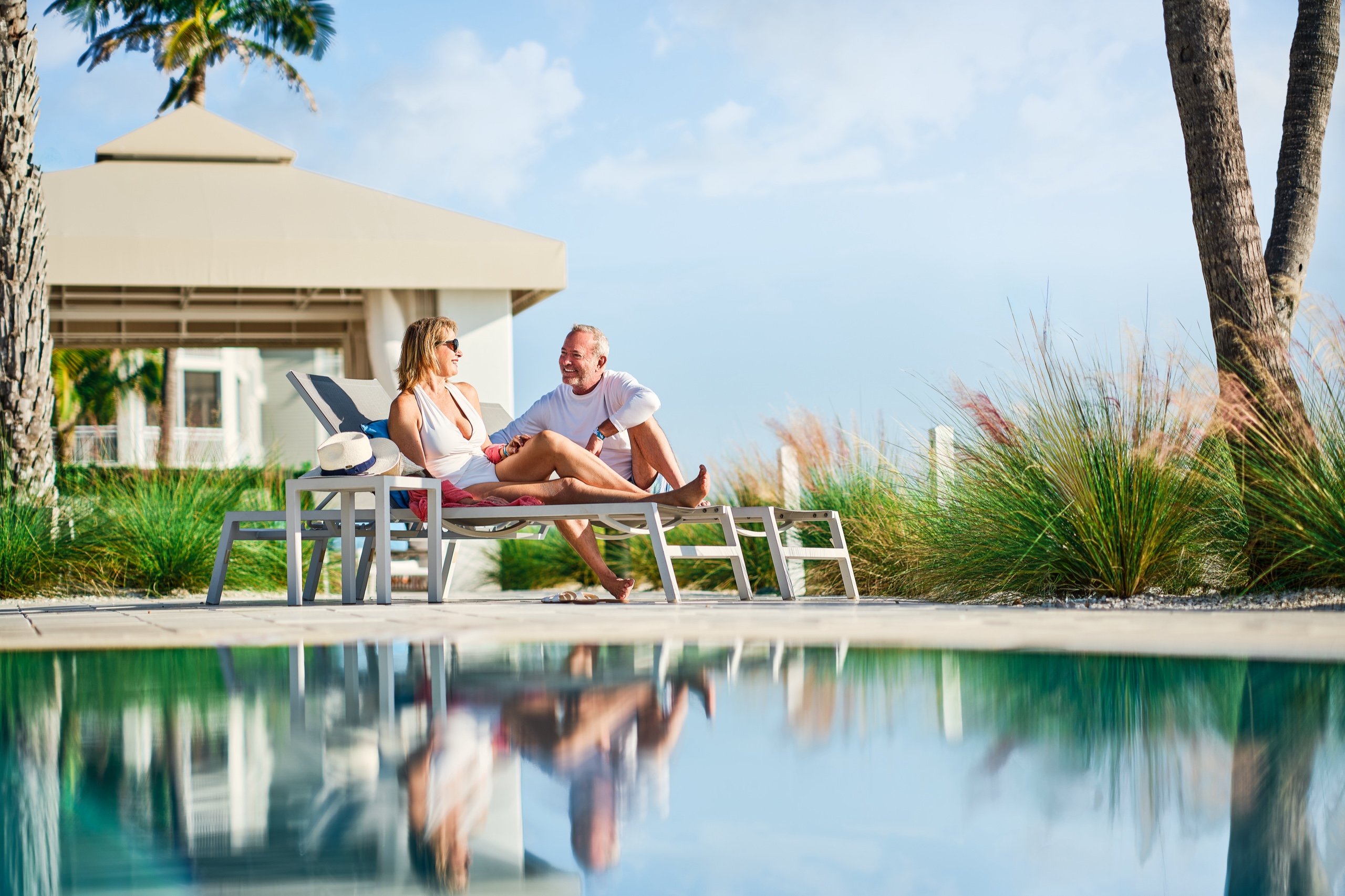 Unwind in luxury with our new Poolside Cabanas, exclusively available for daily rental by guests and owners with Club Captiva amenity access. Cabanas offer seating for up to six guests, complimentary snacks, sodas, and bottled water. Relax in your private oasis, complete with a television and fan for added comfort. Larger Bayfront Super Cabanas are also available, maximizing your poolside experience. Let every moment by the Bayside pools be a blend of indulgence and serenity, surrounded by swaying palms and water views.