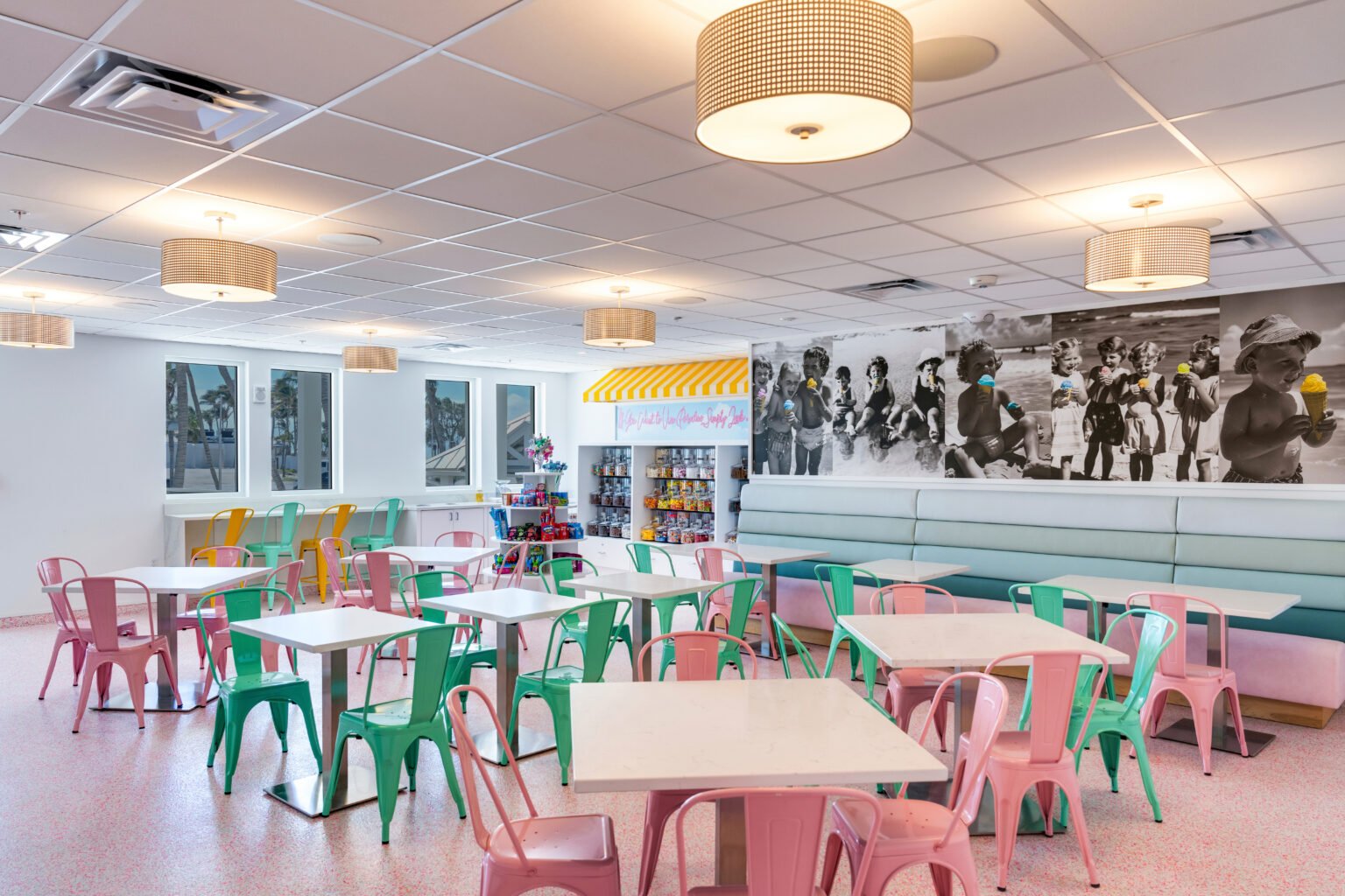 For a casual, quick bite in between pool or beach time, Scoops & Slices offers a convenient dining option near the Bayview Pools. This fan favorite has been reimagined with indoor and outdoor seating, a pink-sprinkle floor, and a vibrant mural wall. Treat yourself to over two dozen varieties of candy, readily available pizza slices and made-to-order specialty pizzas, soft-serve and traditional ice cream in an abundance of flavors, creative sundaes, ice cream with mix-ins, and nostalgic sodas.
