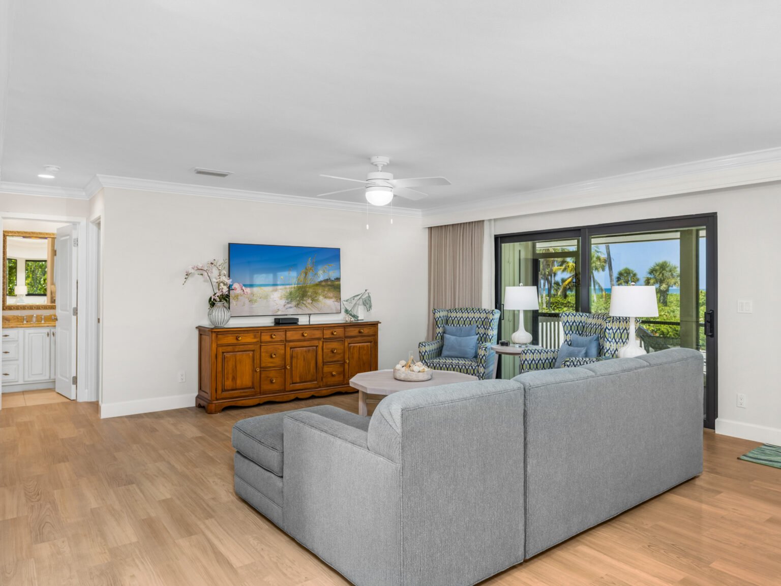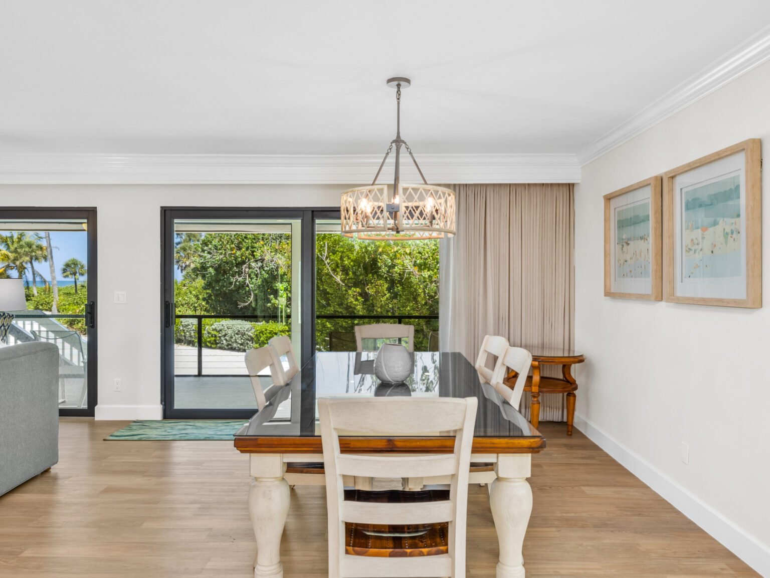 The spacious living room invites relaxation with ample seating, a flat-screen television, and a full wall of sliding glass doors that open onto a screened lanai, blending indoor and outdoor living. The fully equipped kitchen features stainless steel appliances, granite countertops, and crisp white cabinetry. It flows seamlessly into the dining area, which accommodates six guests and also opens onto the lanai for alfresco-style dining.