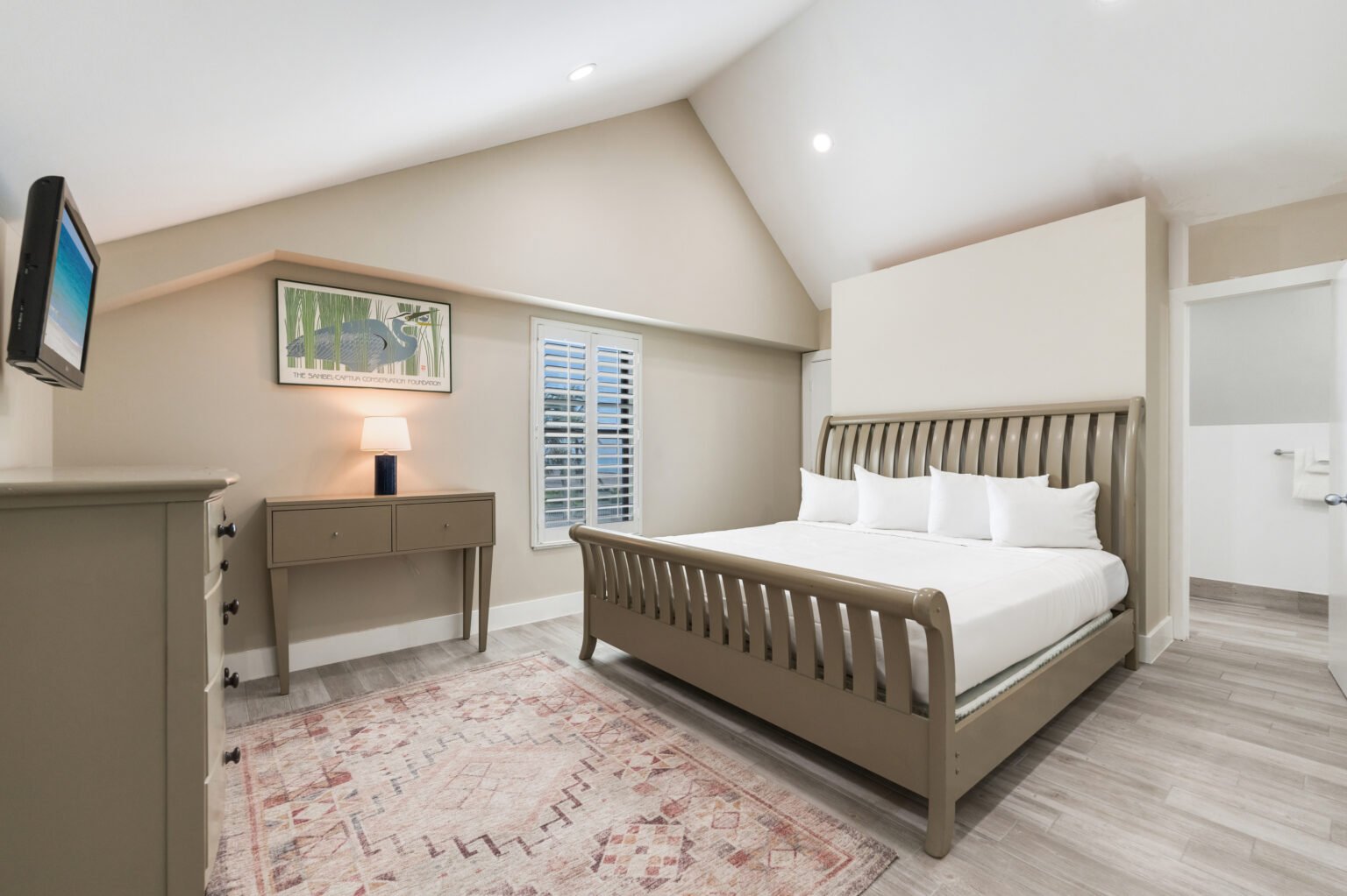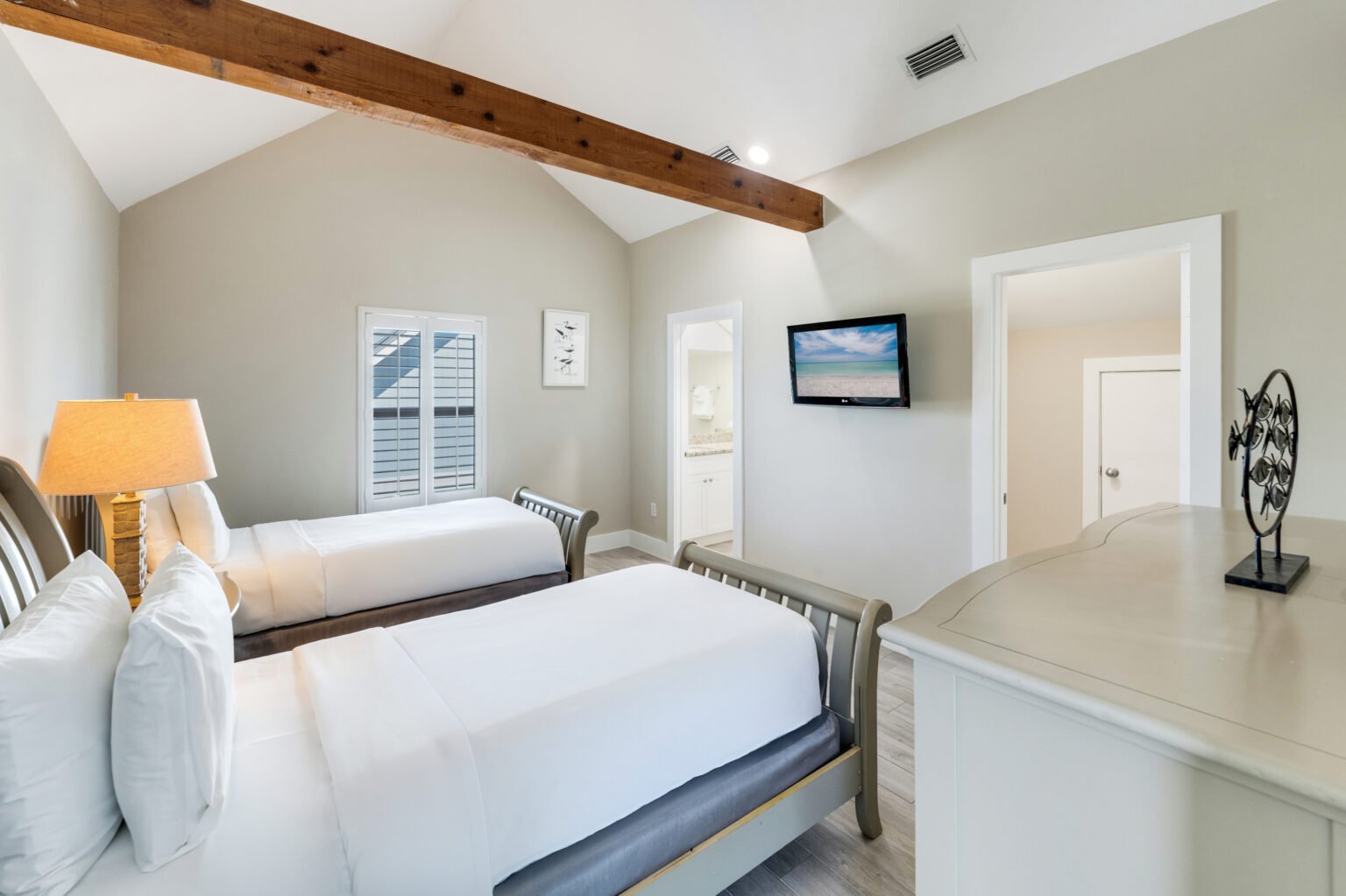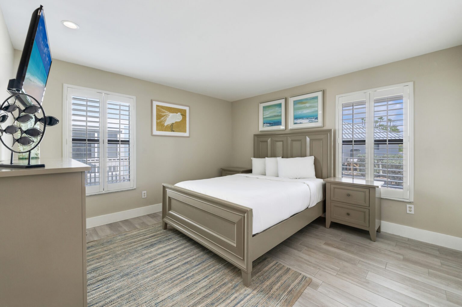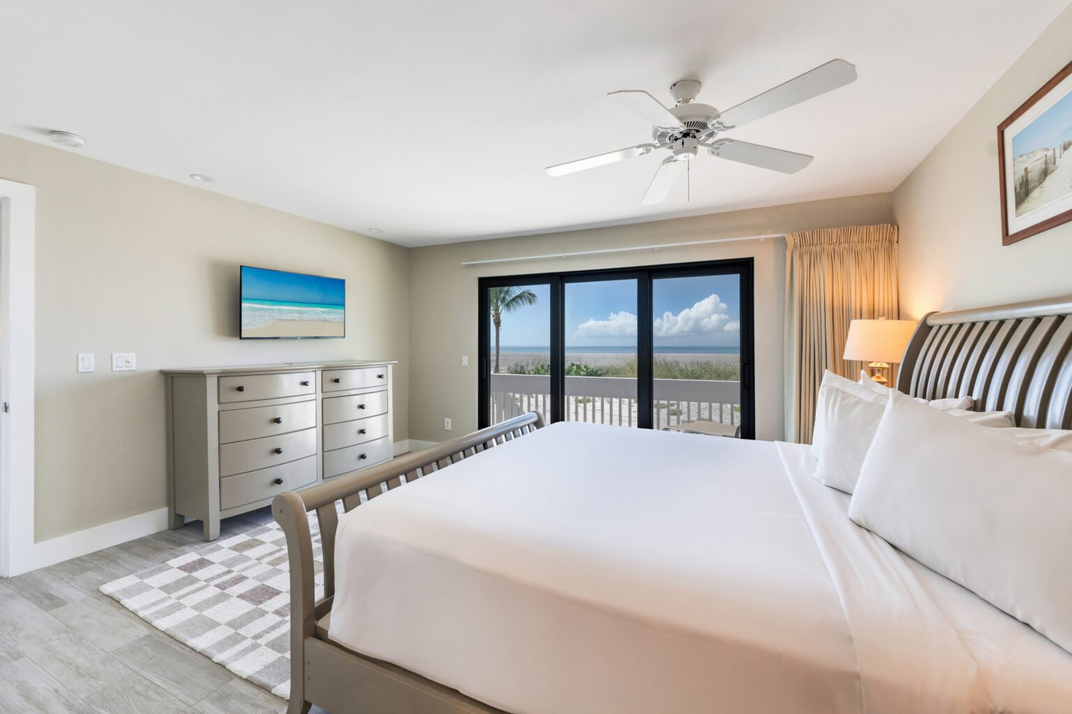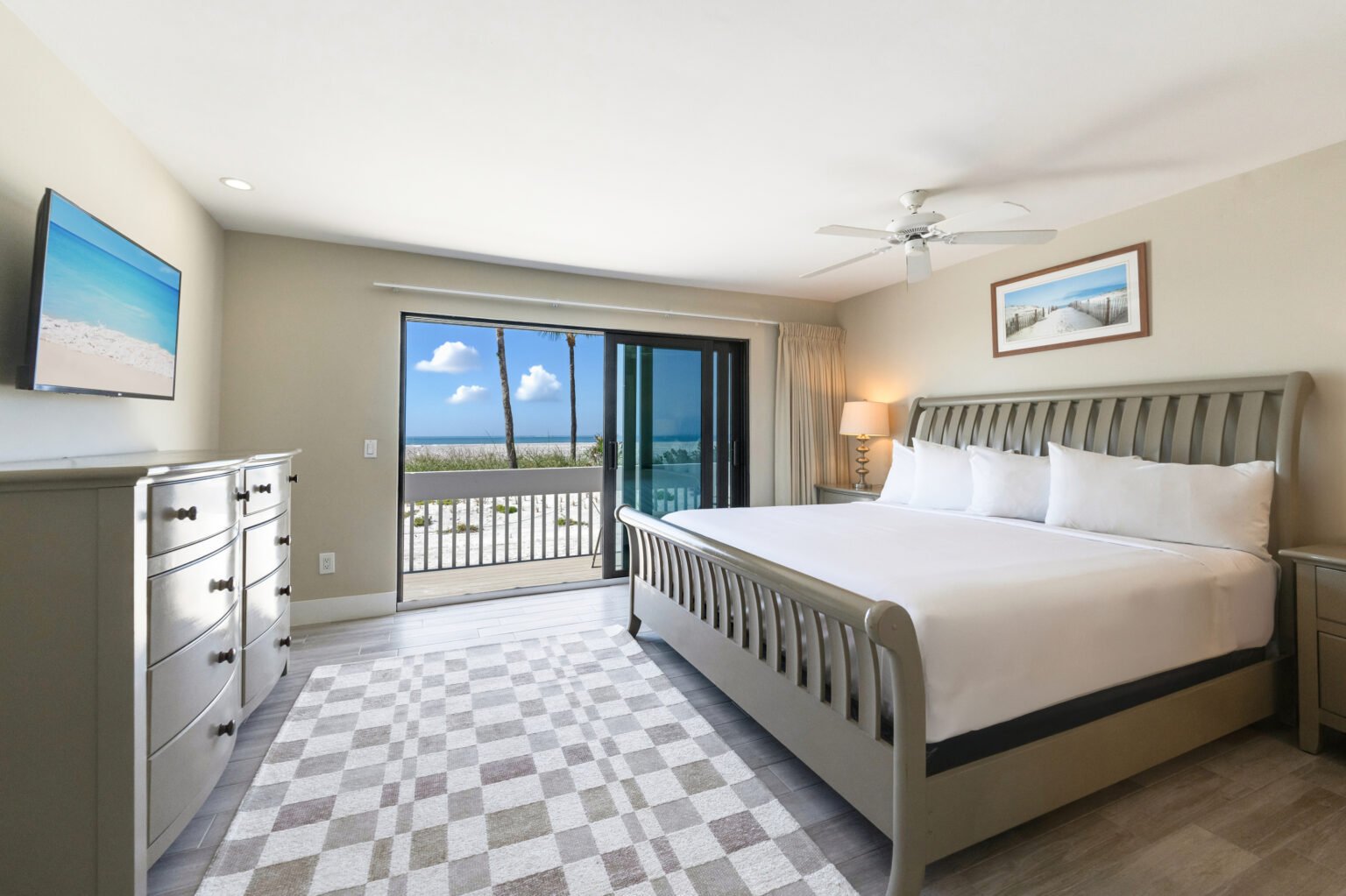 The main level boasts a spacious master suite with a king-size bed, television, and en suite bathroom, all enhanced by sunset and beach views. A second bedroom on this level is furnished with a queen-size bed, with a bathroom conveniently located down the hall.