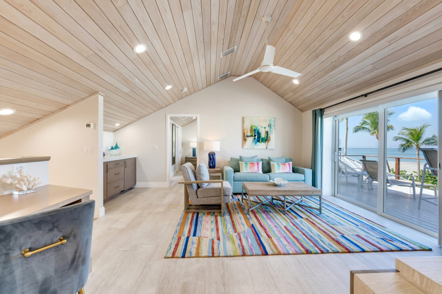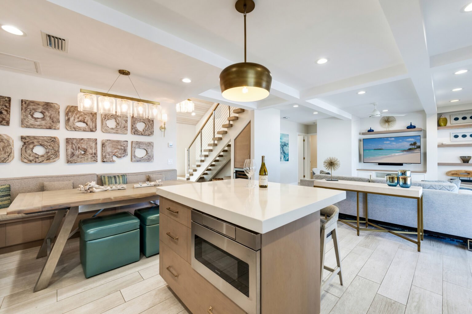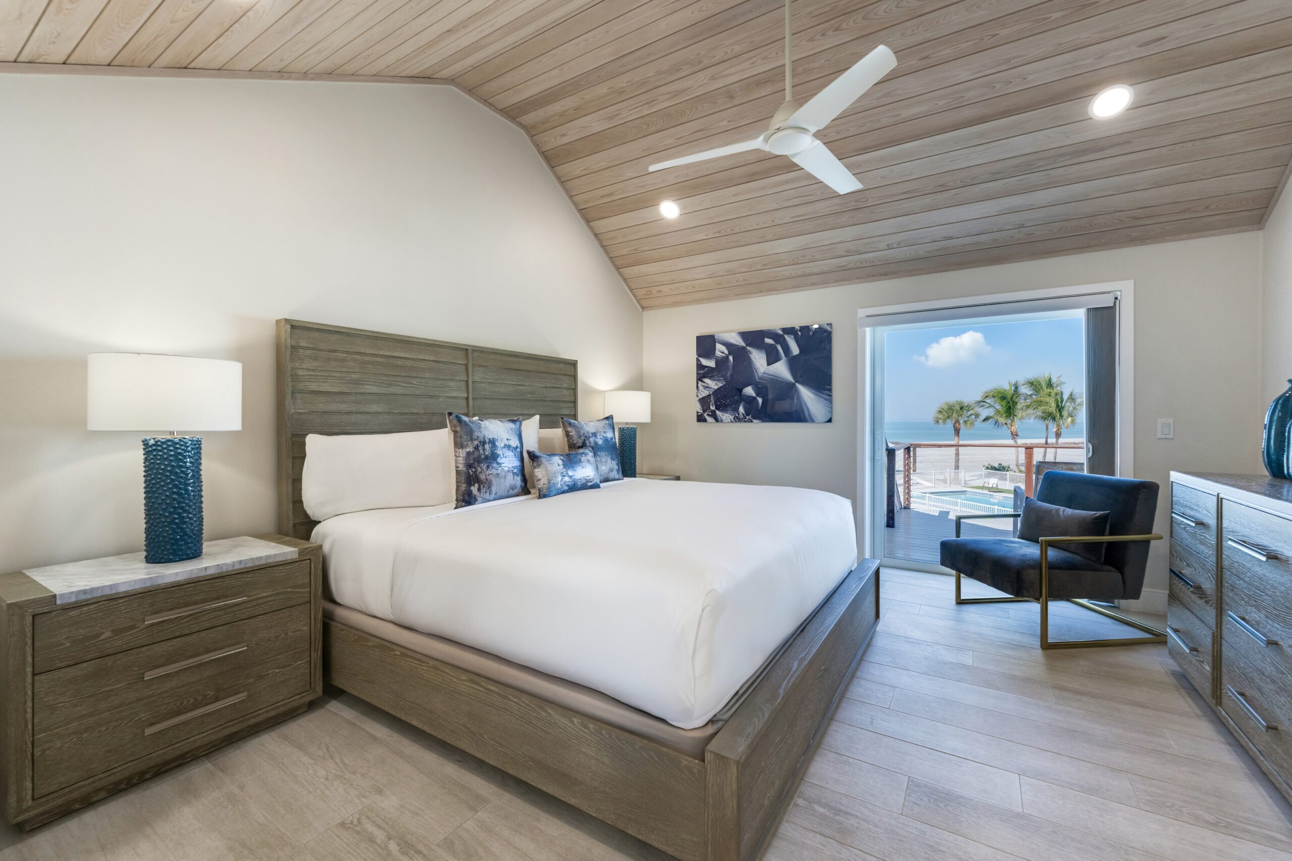 The home’s open layout and thoughtful details create an ideal space for relaxation and entertainment. The fully equipped kitchen features brand-new appliances, while the dining options include a spacious screened lanai overlooking the Gulf and pool or an inviting indoor wood table that seats ten.