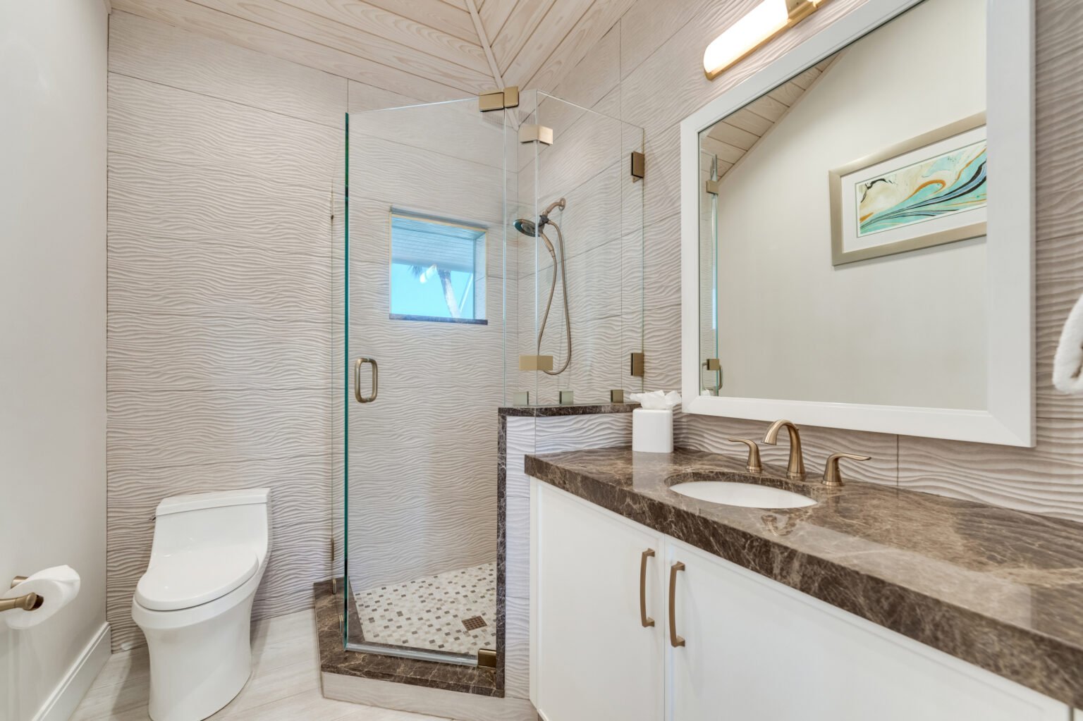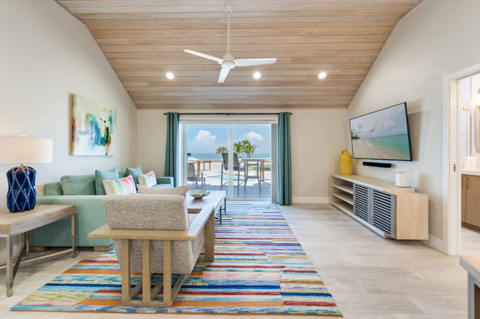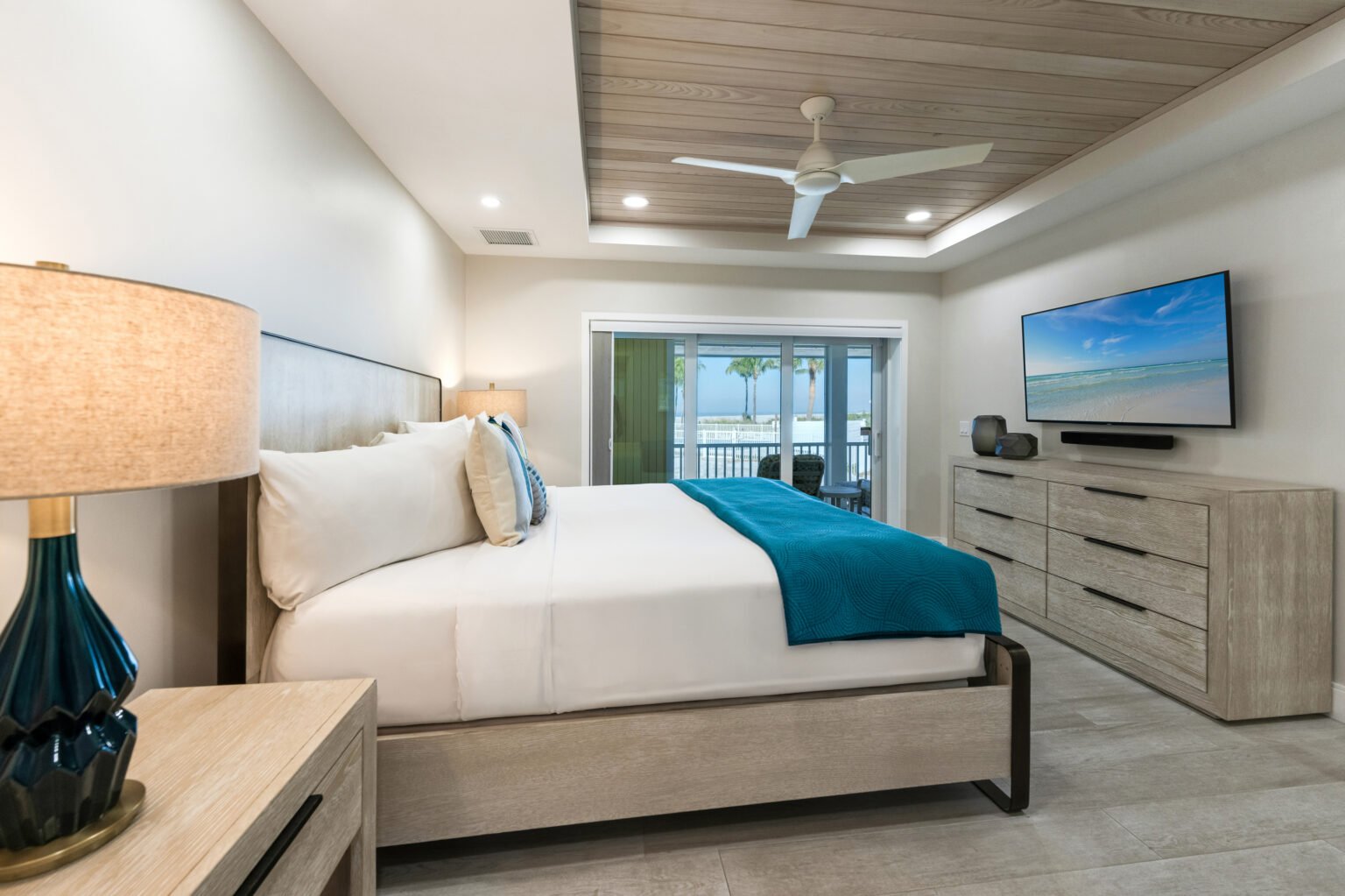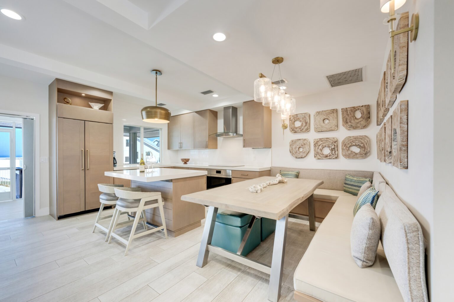The home’s open layout and thoughtful details create an ideal space for relaxation and entertainment. The fully equipped kitchen features brand-new appliances, while the dining options include a spacious screened lanai overlooking the Gulf and pool or an inviting indoor wood table that seats ten.