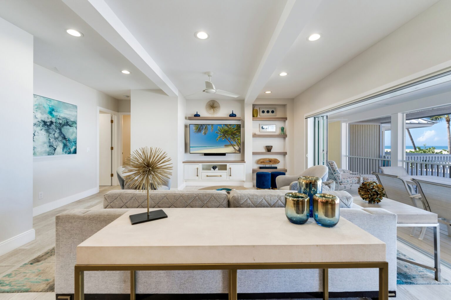 Savor breathtaking panoramic views of the Gulf and Red Fish Pass from this elegant and spacious three-bedroom, three-bathroom villa. Designed with an open floor plan, this coastal retreat offers an inviting space for a relaxing beach getaway.