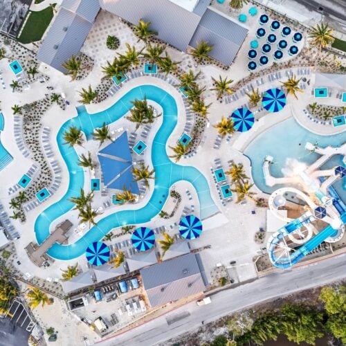 Captiva Landing at South Seas is spotlighted as a rare, year-round U.S. waterpark, featuring heated pools, waterslides, and open-air, island-inspired design.